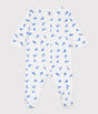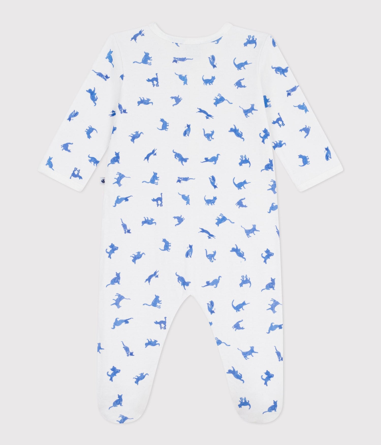 - The pyjama suit opens and is fastened with poppers at the front and between the legs.