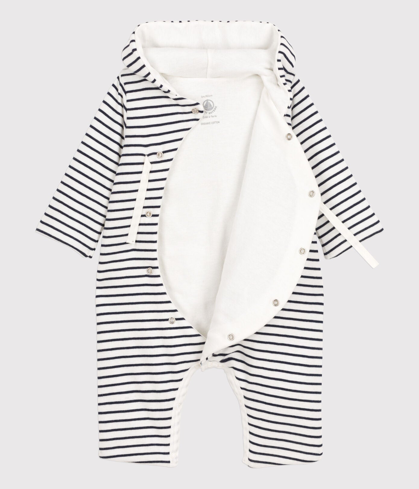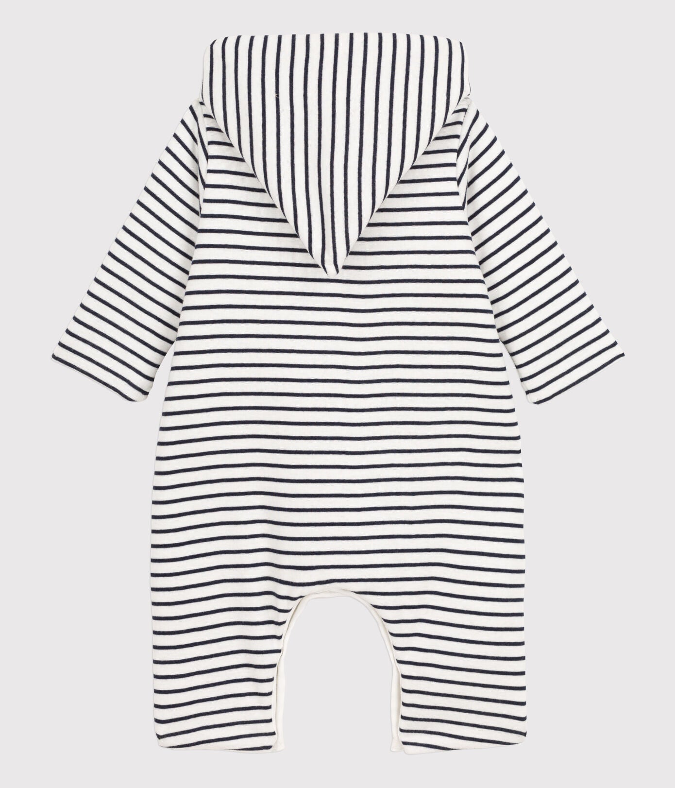 BABIES' HOODED SAILOR STRIPED COTTON JUMPSUIT - Nai is backordered and will ship as soon as it is back in stock.