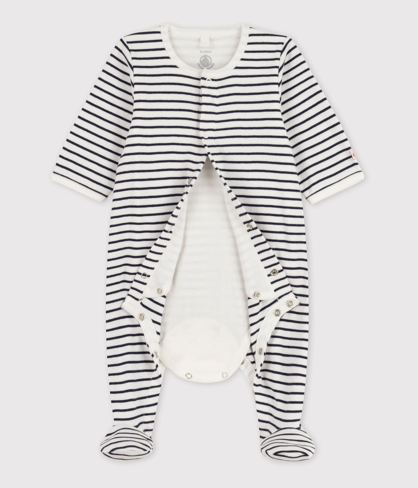 - Super 2-in-1 pyjamas: a sleepsuit with a poppered fastening in front + a built-in bodysuit.